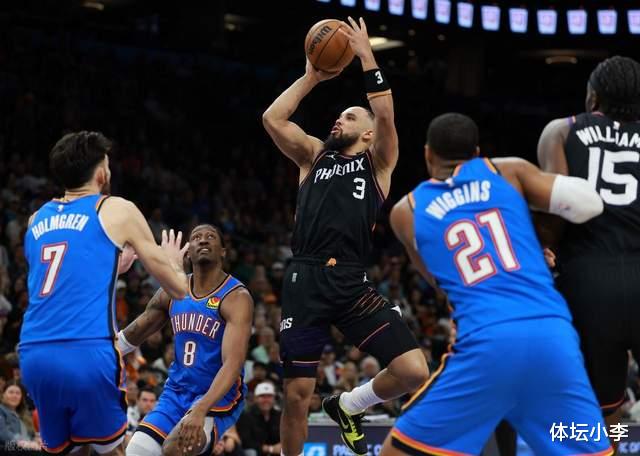 这场比赛雷霆上来早早投入景况,太阳手感低迷,好在之后逐步投入节律,在一度落伍18分的不利地方,打出一波20-2攻势追上比分,之后两队堕入拉锯战,重要时辰狄龙掷中三分卓绝4分,可雷霆蚁合拿分追平,终末0.7秒布克三分一槌定音。