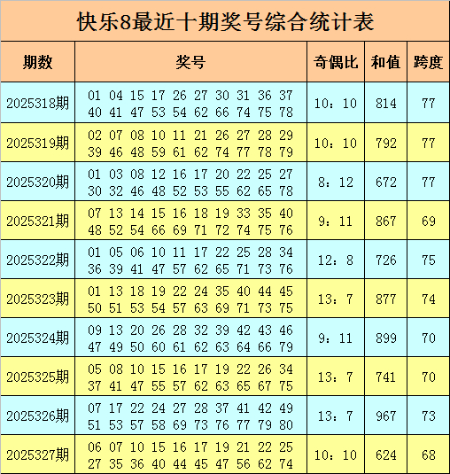 福彩怡悦8第2025327期开奖总结奖号:06 07 10 15 16 17 19 21 22 25 27 35 36 40 44 45 47 56 62 74,其中奖号奇偶比为10:10,和值为624,跨度为68。