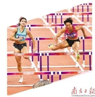 昨年11月19日晚,十五运会女子100米栏决赛举行,广东队选手刘景扬(右)夺冠。 南边日报记者 石磊 摄