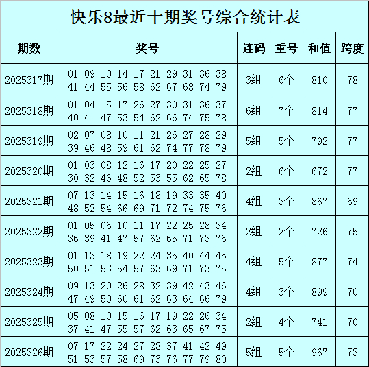福彩惬心8第2025326期开出奖号:07 17 22 24 27 28 37 41 42 49 51 53 57 58 69 73 76 77 79 80,其中奖号和值为967,跨度为73,包含5个重号17、22、37、41、57,包含连码27 28、41 42、57 58、76 77、79 80。