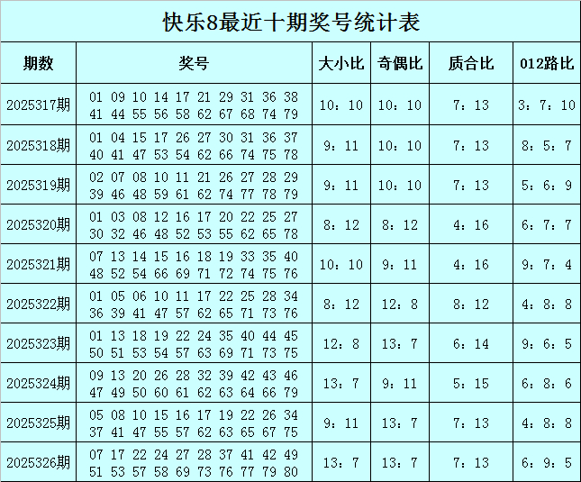 福彩好意思瞻念8第2025326期开奖转头:07 17 22 24 27 28 37 41 42 49 51 53 57 58 69 73 76 77 79 80,其中奖号大小比开出13:7,奇偶比开出13:7,质合比开出7:13,012路比开出6:9:5。
