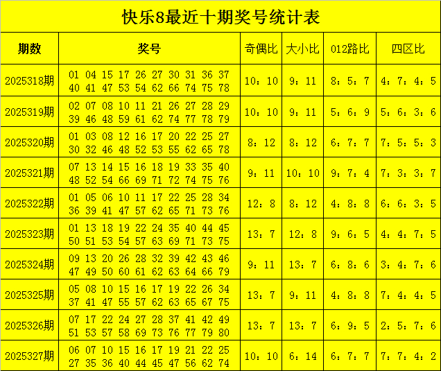福彩现象8第2025327期开奖追念:06 07 10 15 16 17 19 21 22 25 27 35 36 40 44 45 47 56 62 74,其中奖号大小比为6:14,012路比为6:7:7,和值为624,跨度为68,奇偶比为10:10。