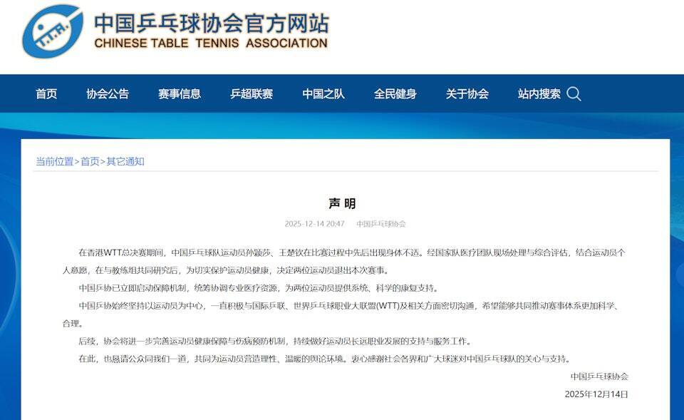 中国乒协主动发声明回话,嘱咐二东谈主退赛因由