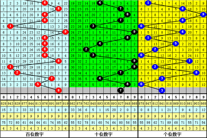 百位上期出现:冷号5,该位相连十期以热号出现较多,以温号、冷号出现较少,现在百位热号有6个:1、2、5、6、7、8,本期看好开出热号再次出现,参考号码8。