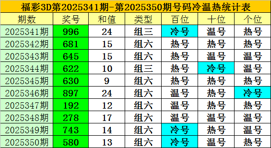 上期回来:福彩3D第2025350期开奖奖号为:580,奖号类型为:组六,奖号冷温热态为:冷号+温号+热号。