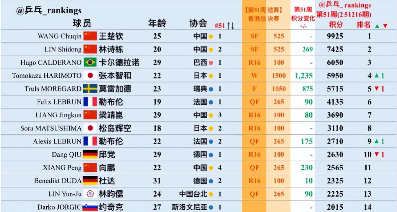 天然王楚钦只打入四强,但他莫得减少积分,现在照旧9925分,他依旧是天下第一。